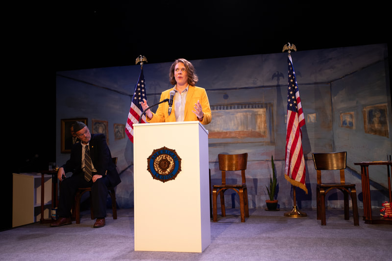 "Kinder’s performance throughout is outstanding, mastering the narrative shifts with remarkable ease and conveying the expected, appropriate emotion and attitude based on her persona. Whether the subject is Patrick Swayze or Antonin Scalia, her words are articulate, pointed, and profound. Waugh proves to be more than just a clock-watching showpiece in uniform when he delivers his own piercing monologue about male behavior. As the only man on stage, considering the much discussed male-centric Constitution, his speech and presence have a positive, reassuring effect....Brien Lang’s skilled, concise direction, coupled with Kinder’s superlative performance, makes for an inviting, illuminating theater experience, and accessible to everyone."